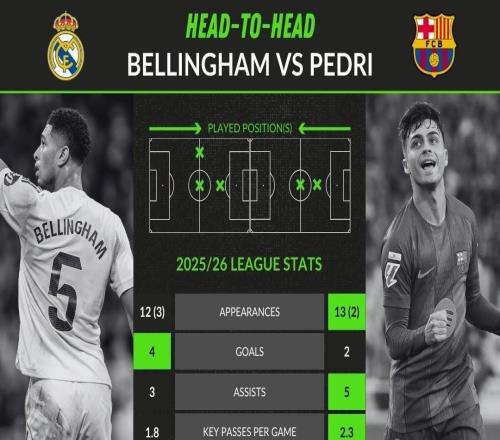 雙核聯賽數據對比:貝林15場4球3助攻,佩德里15場2球5助攻
