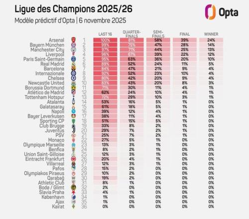 北京時間11月6日,在歐冠聯賽階段第4輪的比賽結束后,Opta預測了36支參加球隊晉級16強、1/4決賽、半決賽、決賽以及奪冠的概率。