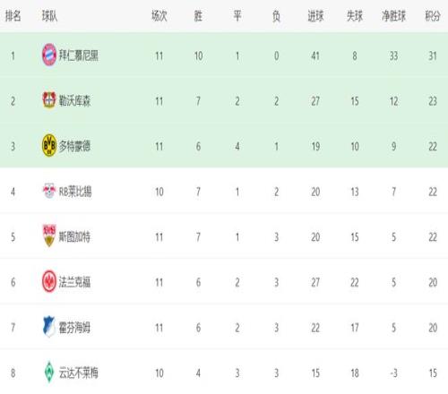 在積分榜上,拜仁牢牢占據榜首位置。拜仁10勝1平保持不敗,拿到了31分。勒沃庫森贏球之后,總積分達到23分,超越了多特蒙德,升到第2名,但與拜仁的差距依然很大,足足落后8分。多特蒙德以22分排名第3。萊比錫和斯圖加特也是22分,排名第4和第5。法蘭克福和霍芬海姆都是20分,排名第6和第7。不萊梅以15分排名第8。