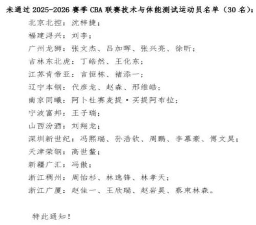 不久前有媒體發出CBA體測未能通過球員的名單,我們看到多達30人。球迷們比較熟悉北控隊的沈梓捷,遼寧隊的代彥龍、趙森、邢維皓,深圳隊的周鵬、李慕豪,孫浩欽等人均未通過,他們后續將進行補測。