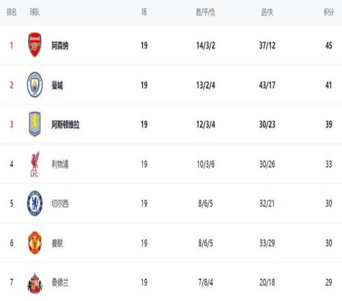 在積分榜上,阿森納以45分排名榜首,戰績是14勝3平2負。曼城丟掉2分,總積分是41分,落后阿森納4分。曼城爭冠難度一下子變大了。阿斯頓維拉次輪輸給阿森納,依然是39分,排名第3,在爭冠集團中有點掉隊。利物浦33分排名第4。第5的是切爾西,拿到30分。曼聯也是30分,排名第6。桑德蘭這匹黑馬以29分排名第7。熱刺和紐卡斯爾聯都是26分,排名第12和第13。